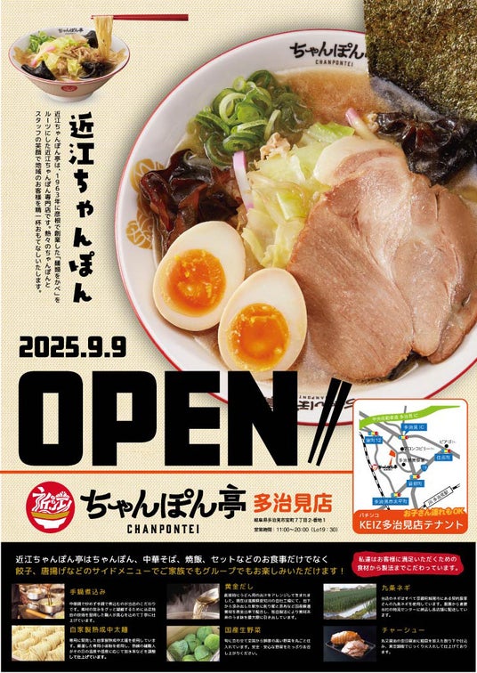 「近江ちゃんぽんをニッポンのちゃんぽんに!」を掲げるドリームフーズ株式会社が、2025年9月9日(火)、岐阜県多治見市に新店舗「近江ちゃんぽん亭 多治見店」をオープンします。岐阜県では3店舗目の出店となります。