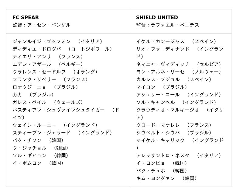 この特別なイベントでは、総勢32名の伝説的プレイヤーが、攻撃的な「FC SPEAR(槍)」と守備的な「SHIELD UNITED(盾)」の2チームに分かれて対決します。