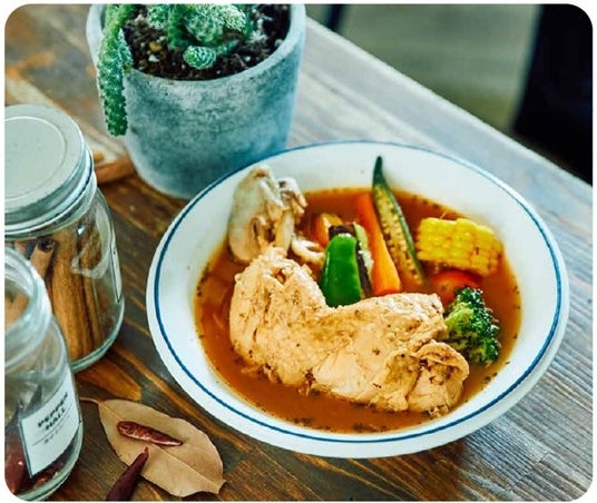 • 「スープカレー専門店 SPICE CHUNKY」: 綾町産の香味野菜とみやざき地頭鶏(じとっこ)を使った、野菜と鶏の出汁が効いたグルテンフリーのスープカレー。