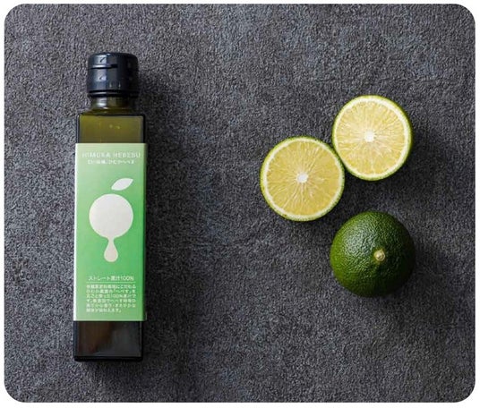 有機質肥料栽培にこだわる「ひむか農園」のへべすを丸ごと搾った無添加100%果汁。1瓶にへべす5~6個分の果汁が含まれています。