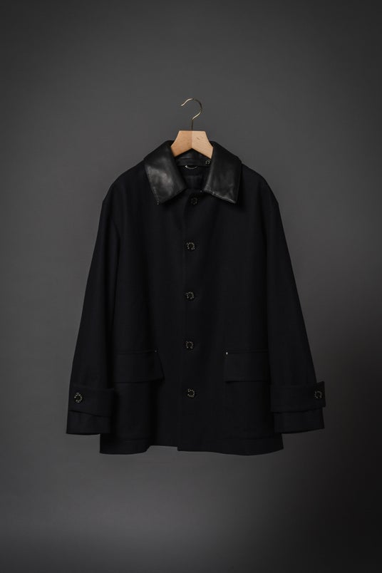 今回別注されたのは、マッキントッシュの定番モデル「HUMBIE」。エディフィスは、このモデルに英国のハンティングジャケットを想起させる**“レザー襟”**を特別にあしらいました。このレザー襟が、伝統的なムードにラグジュアリーな質感を重ね、一着に気品ある存在感を加えています。