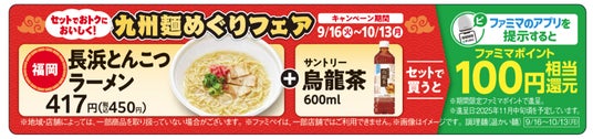 フェア期間中、「九州麺めぐりフェア」の対象商品とサントリー烏龍茶600mlを、ファミペイを提示して購入すると、ファミマポイント100円相当が還元されるキャンペーンも実施されます。