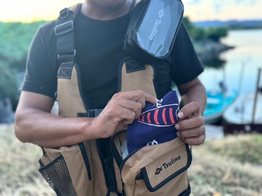 薄くてコンパクトにたためる手ぬぐいは、道具を多く持ち運ぶ釣り人にとって、タオルよりも重宝するアイテムです。