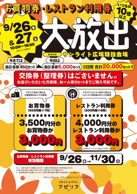 1. お買物券・レストラン利用券大放出 9月26日(金)、27日(土)の2日間、お得な商品券の販売会が開催されます。