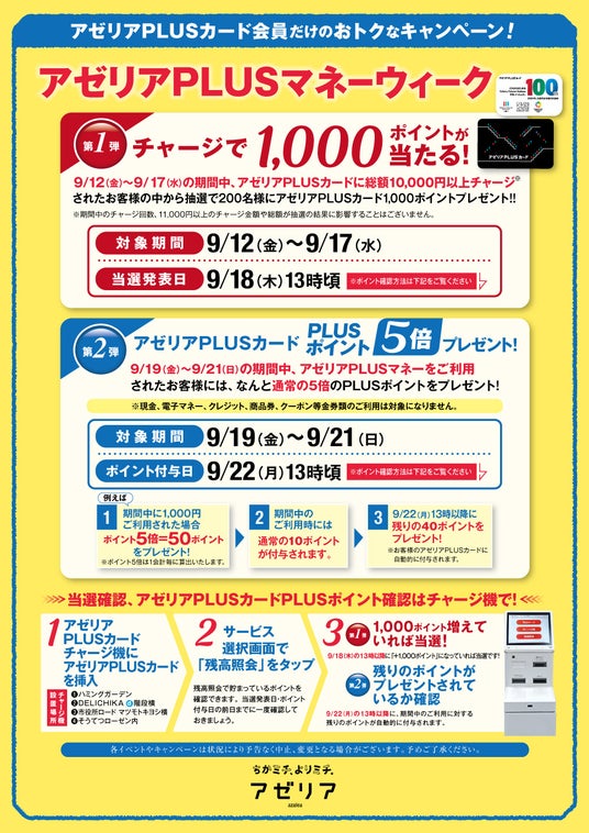 2. アゼリアPLUSマネーウィーク アゼリアPLUSカードの利用がお得になるキャンペーン。抽選でポイントが当たったり、期間中の利用でポイントが5倍になったりと、嬉しい特典が満載です。