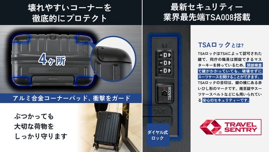 - 大切な荷物を徹底的に保護 壊れやすい四隅にはアルミ製のコーナーパッドを配置。また、海外旅行でも安心なTSAロックを搭載し、鍵の紛失リスクも防ぎます。