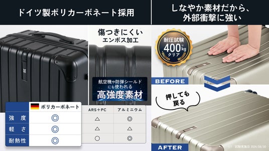 - 航空機にも使われる「高耐久ポリカーボネート100%」 従来のモデルからさらに進化し、航空機や防弾シールドにも使われるドイツ製のポリカーボネートを100%採用。衝撃に強く、軽くて丈夫なので、大切な荷物をしっかり守ります。