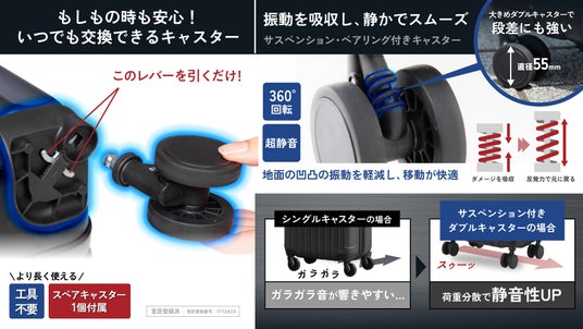 - 工具不要!ワンタッチで交換できるキャスター 旅先でのトラブルにすぐ対応できるよう、工具を使わずに簡単に交換できるキャスターを搭載。さらにサスペンションとベアリング内蔵で、静かで滑らかな走行を実現しました。