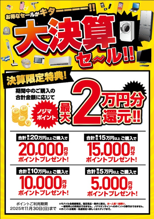 9月13日(土)より、「決算セール」がスタート。期間中に対象商品を購入すると、金額に応じて最大20,000円分のノジマポイントが還元される、お得なキャンペーンが実施されます。