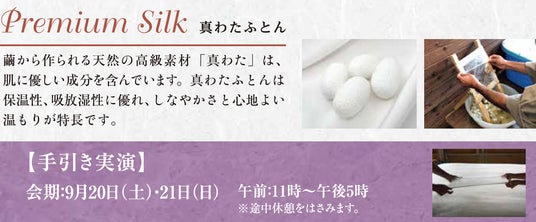 この販売会では、特別企画として、2025年9月20日(土)と21日(日)の2日間限定で「真わた手引き実演会」が行われます。熟練の職人が、繭から真わたを一枚ずつ丁寧に引き伸ばす伝統の技を、目の前で披露します。