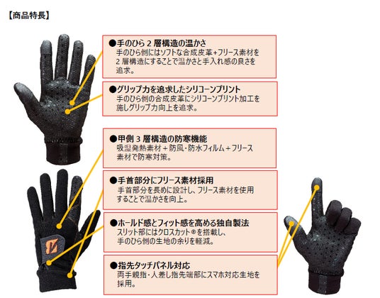 • スマホ対応: 両手親指と人差し指の先端はスマホ対応生地なので、グローブをつけたままタッチパネルの操作が可能です。