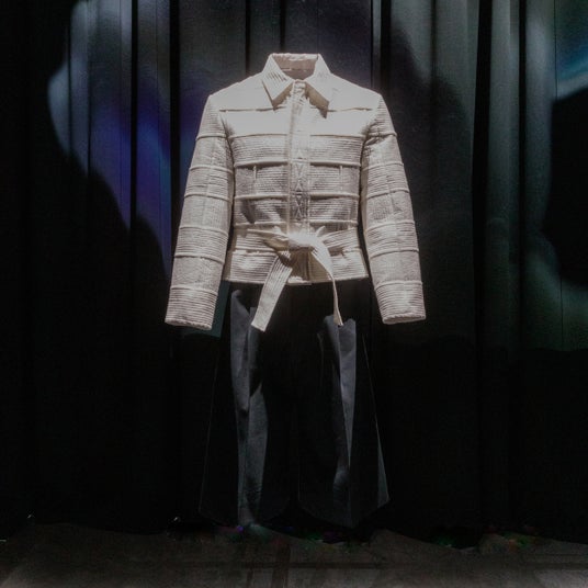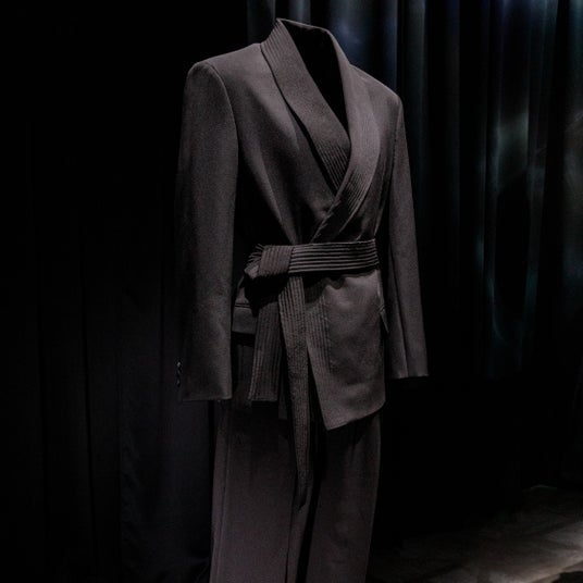 - 師範の威厳を漂わせるダブルブレストブレザーは武道の結びで留められ、ワイドトラウザーと組み合わせて流麗さを強調。