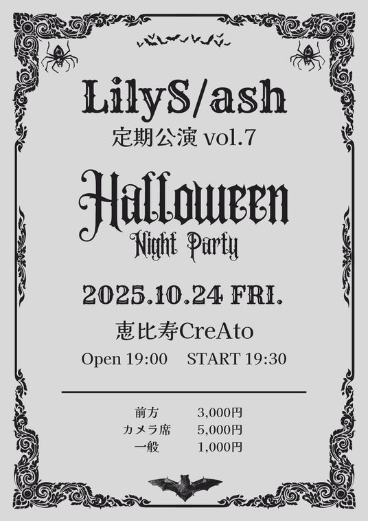 2025年10月24日(金)に恵比寿CreAtoで行われる**『LilyS/ash 定期公演 vol.7~Halloween Night Party~』は、この日だけの限定衣装とダークな世界観**で、ファンを幻想的な一夜に誘います。