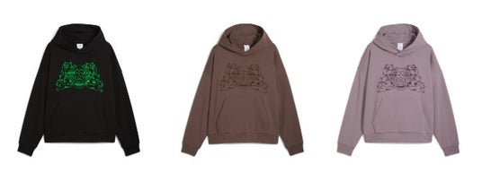 - アパレル: オーバーサイズのTシャツやフーディー、ワイドスウェットパンツといった定番アイテムに加え、鮮やかなグリーンとブラックのニットベスト、リバーシブルのスカルビーニーなど、個性の際立つアイテムがラインアップ。