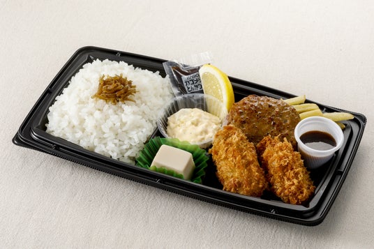 ジューシーなハンバーグと、サクサクな牡蠣フライの濃厚な旨みがバランスよく楽しめるお弁当です。