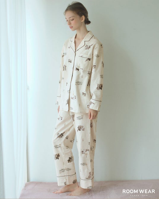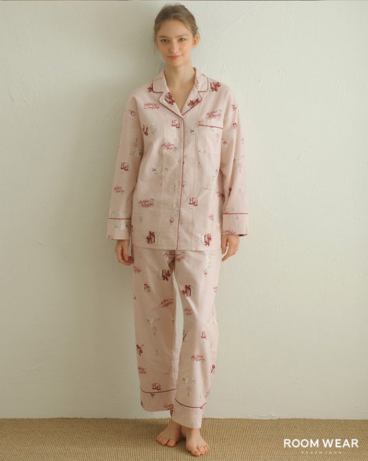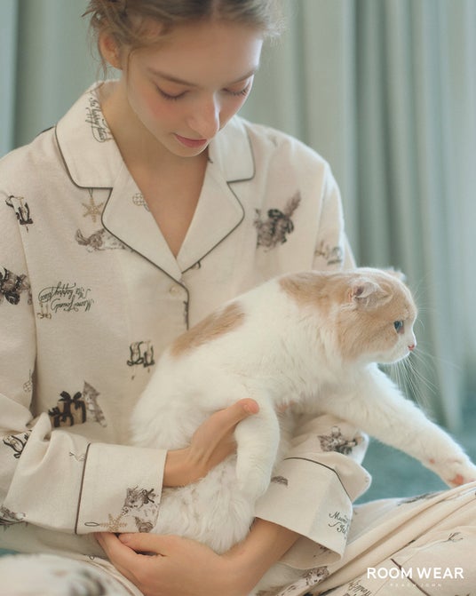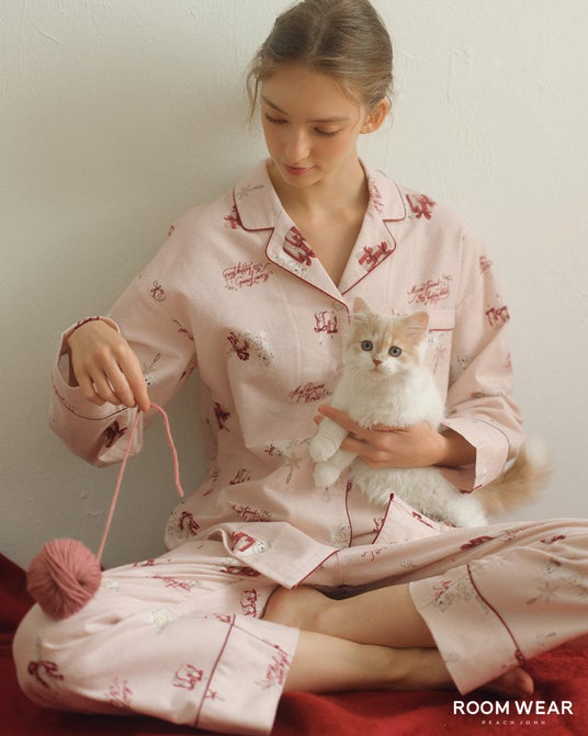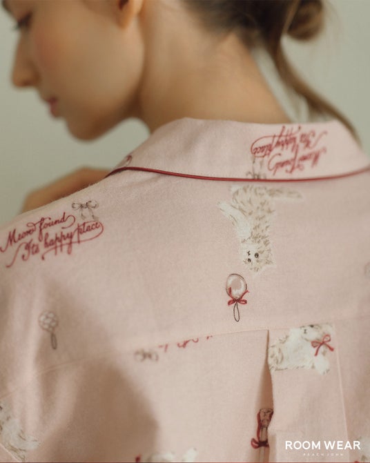 - シャツパジャマ: スタンダードな開襟シャツタイプ。子猫とホリデーモチーフのプリント柄。配色のサテンパイピングがアクセント。