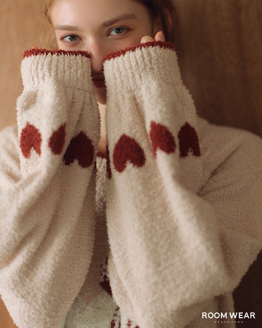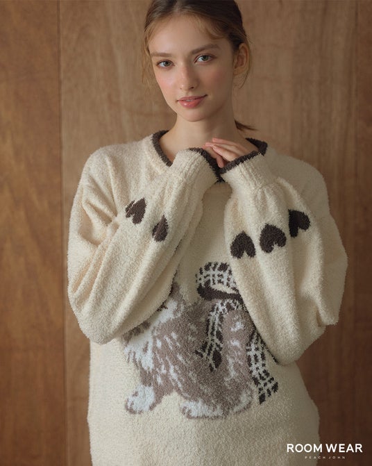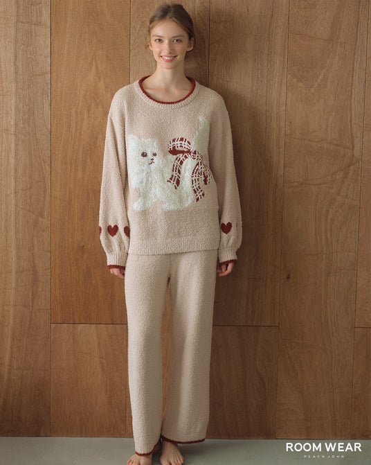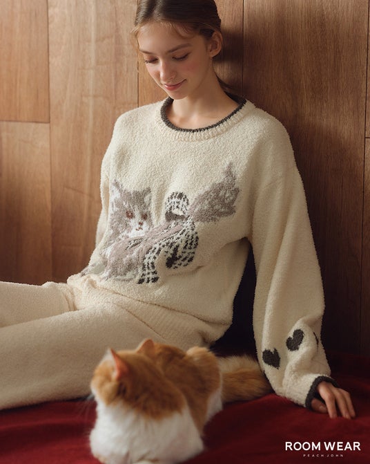 PEACH JOHN ROOMの冬の定番、ホイップクリームのように柔らかなモールニット**「ホイップリー」**素材を採用。リボンを結んだ子猫のジャカード柄が散りばめられたキュートなニットパジャマです。