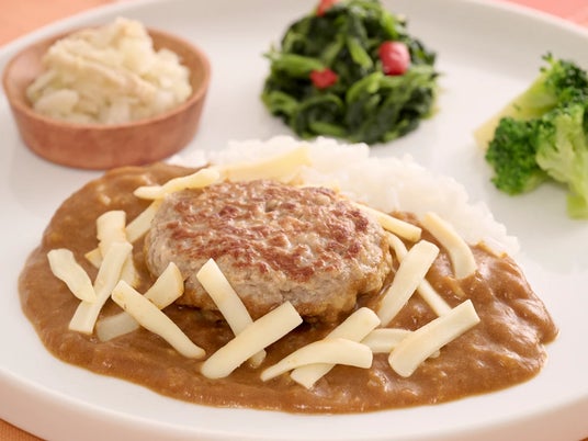 CoCo壱番屋特製のビーフカレーにジューシーなミニハンバーグととろけるチーズをトッピング。ハンバーグとチーズのコクがビーフカレーにベストマッチしています。ご飯はカリフラワーと白米をブレンドしたヘルシーなオリジナルライスです。