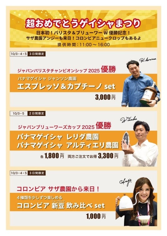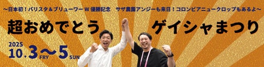 華々しい快挙を祝う特別な3日間。「超おめでとう ゲイシャまつり」で、世界に誇るサザコーヒーの味と、イケメンバリスタ二人の偉業をぜひお祝いしましょう!