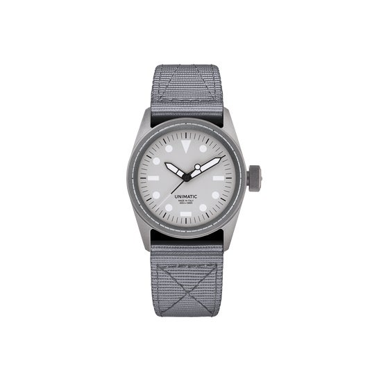 - 特徴:シリーズ最小径36mmのコンパクトモデル。サンドブラスト加工された特徴的なセメントグレーカラーのケースが都会のエレガンスを体現。クールグレーのナイロンストラップが付属し、高い耐久性と実用性を追求しています。