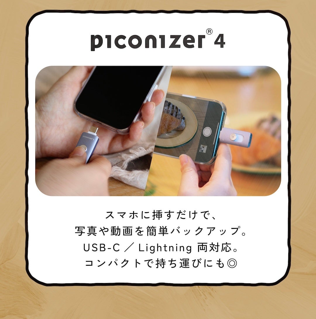 - Piconizer 4: スマホに挿すだけの高速バックアップ。USB-C/Lightning両対応でiPhone・Android・PC間のデータ転送も楽々。専用カメラ機能を使えば、スマホ容量を気にせず写真撮影が可能!15%OFF!