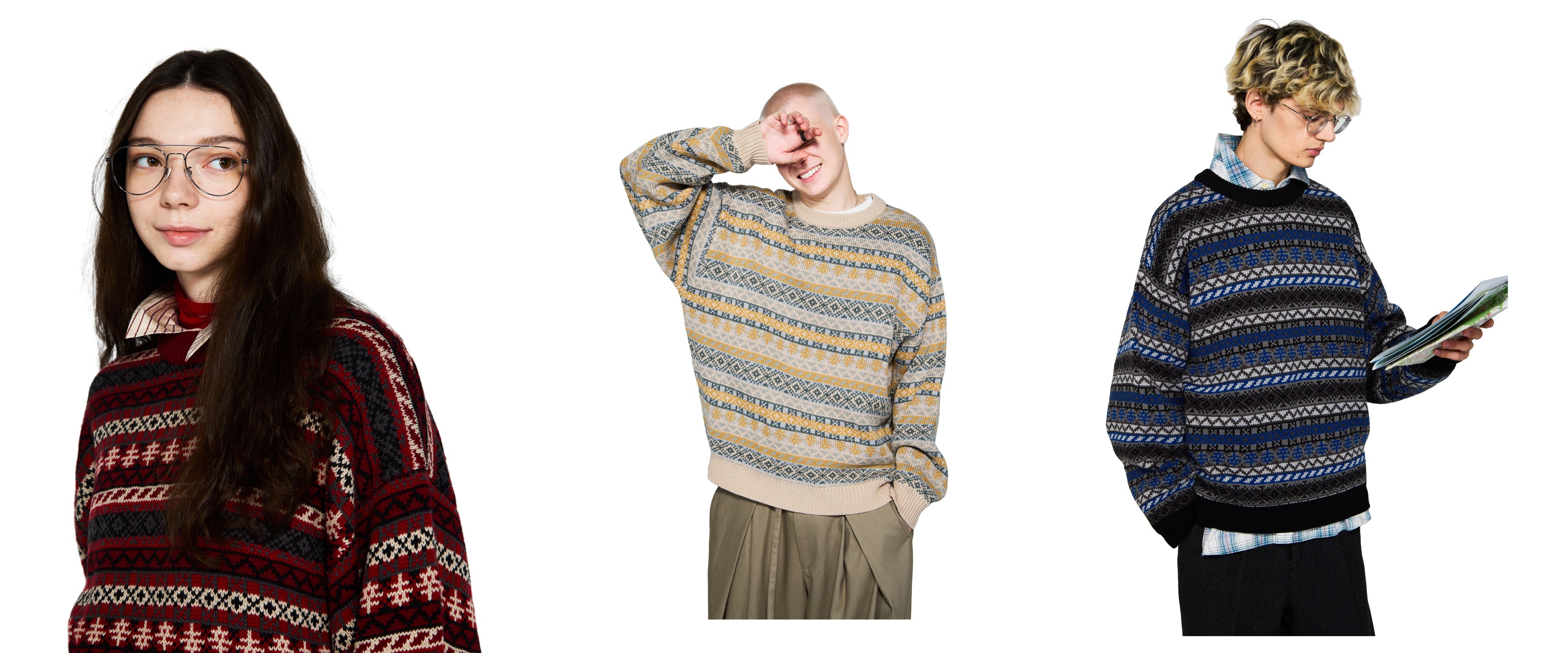 • 「辛」の文字を組み込んだオリジナルノルディック柄の**「ジャガードニット」**