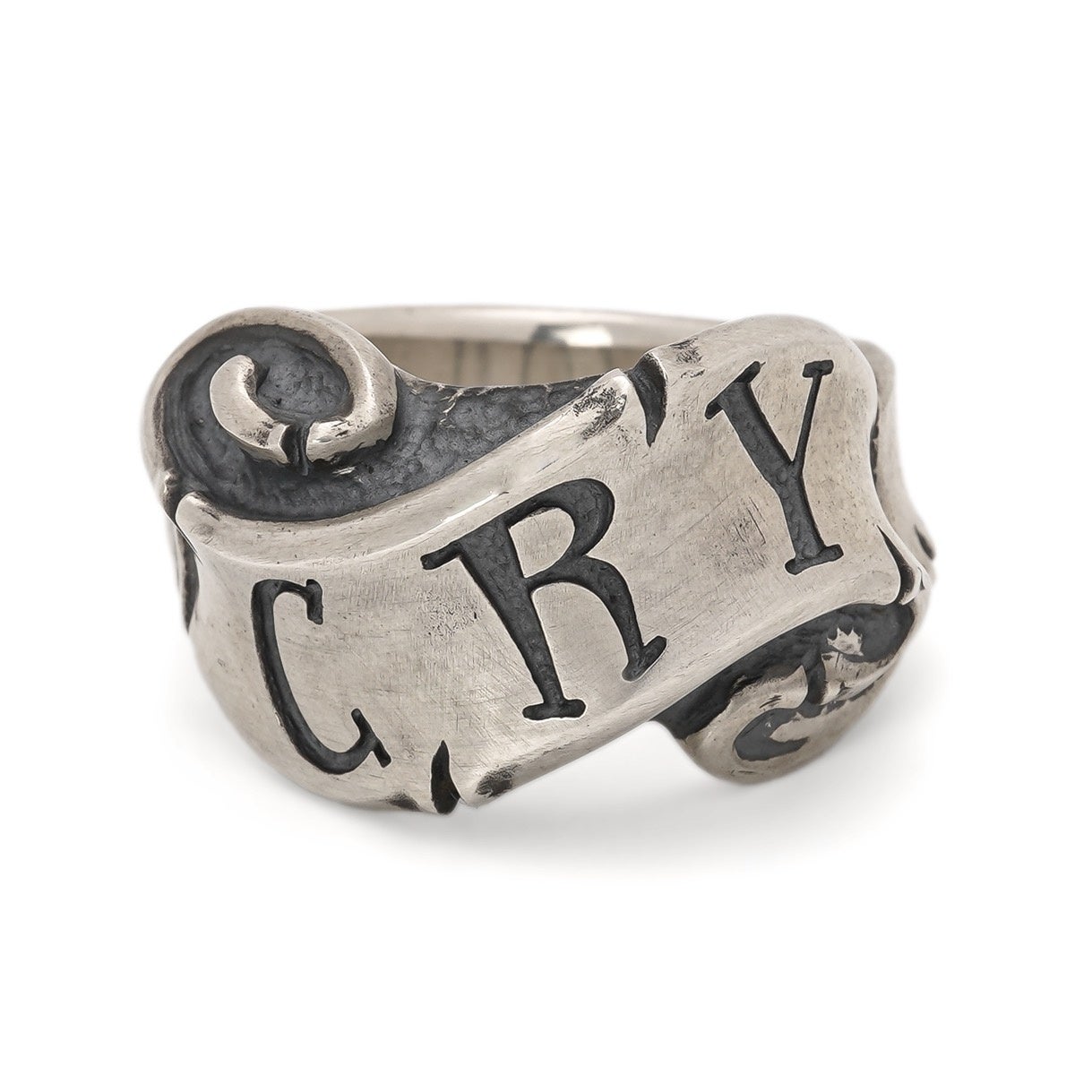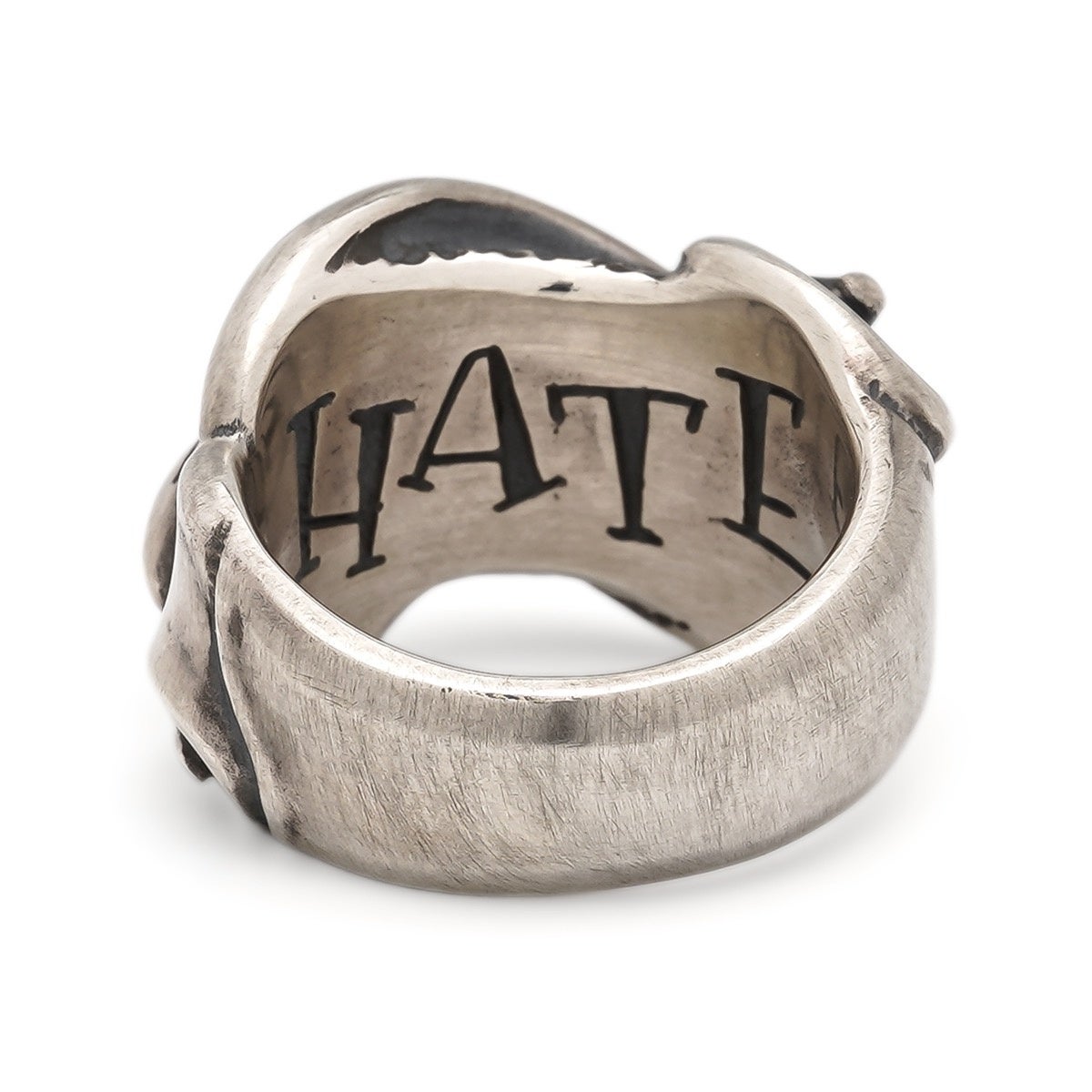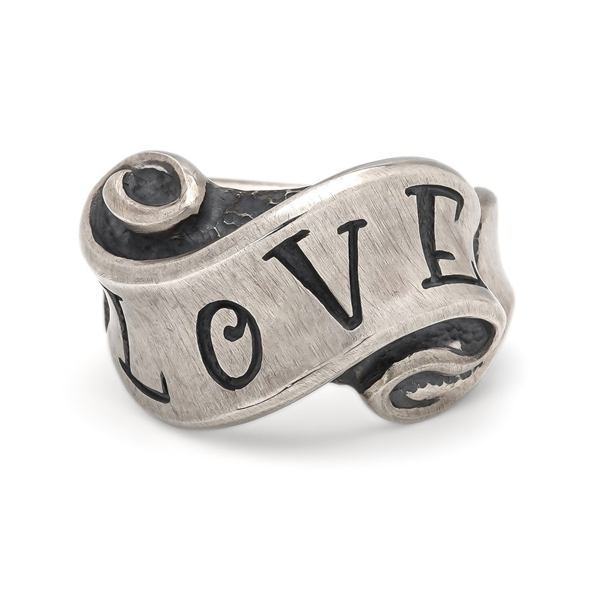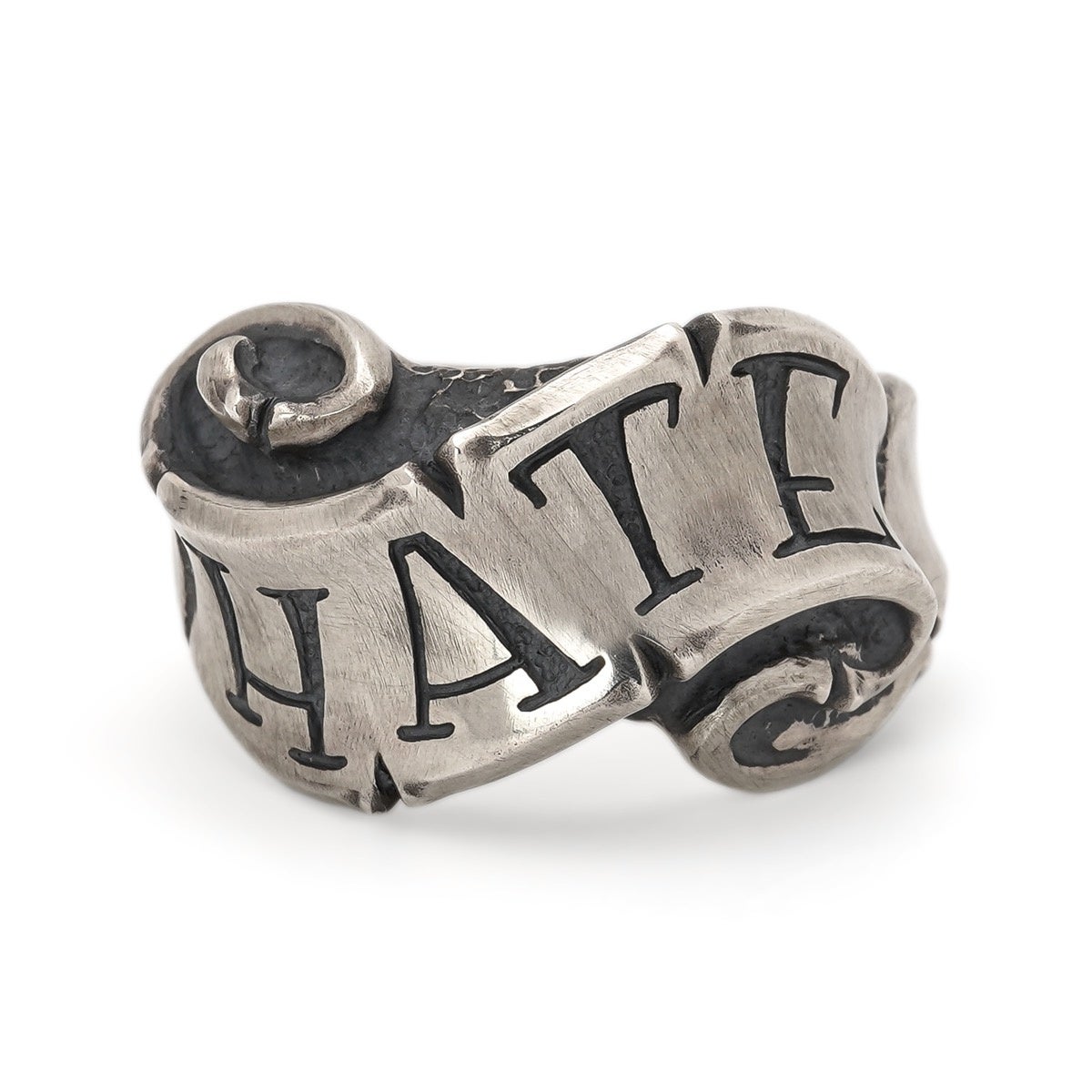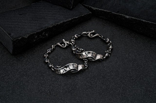 滑らかなリボンに「LOVE・HATE・CRY」などのメッセージが刻まれた人気シリーズ。「愛と憎しみは表裏一体」を表現した王道モチーフです。