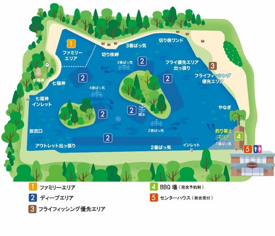 - 都内最大級の広さ!: 湖面面積は約7,000平方メートル。自然豊かなパーク内の地下水を汲み上げており、開放的な空間で釣りを楽しめます。