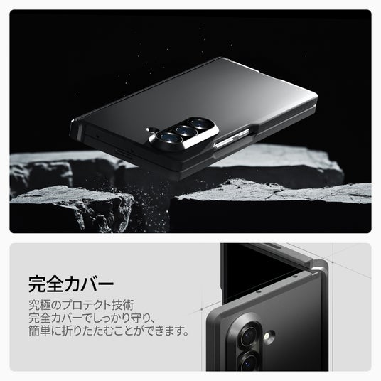 ヒンジ部分まで隙間なくフルカバーする設計。10万回以上のスライドテストをクリアした「セミオートスライド機構」で、耐久性と操作感を両立しています。