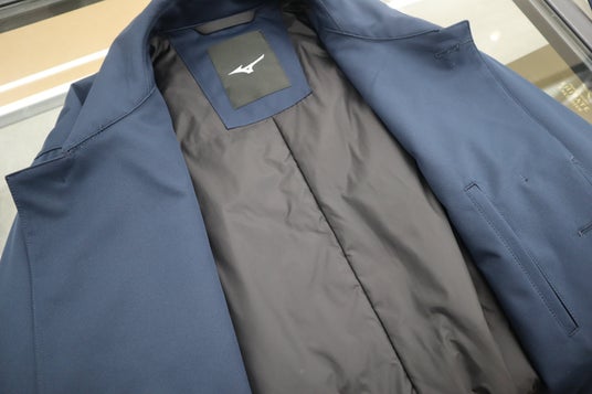 このコートの最大の特長は、ミズノ独自の吸湿発熱素材『ブレスサーモ』を、熱を感じやすい背中部分に搭載している点です。