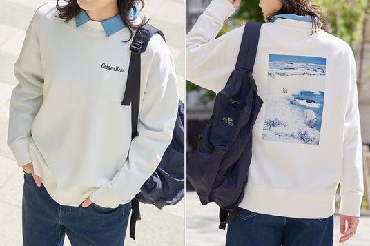 今回のコラボスウェットには、「いつか家族の思い出になる服」というGolden Bearの想いから、前川貴行氏の作品からシロクマ親子の写真が2枚セレクトされ、プリントされています。