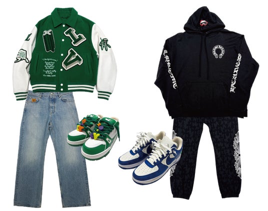- ルイヴィトン: RM212エンブロイダリー バーシティ スタジアムジャケット、ワイドレッグフィットデニムパンツ、トレイナーマキシライン スニーカーなど