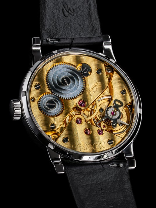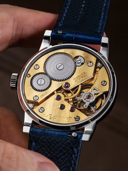- 手作業による仕上げ: ベースのETA6498-1を、時計師・飯塚氏の手作業(ヤスリがけ)による独自のブリッジシェイプや幅広の面取りでカスタム。