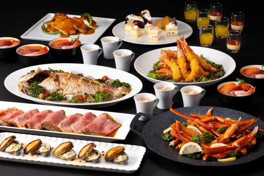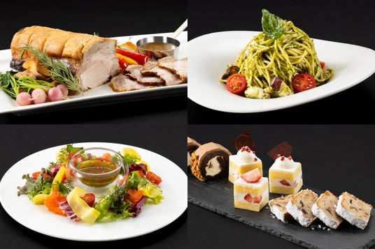 | クリスマススペシャルディナーバイキング | 12/20~25 | ¥9,000 | A5ランク白老牛のローストビーフ(トリュフソース)、ロブスターのテルミドールグラタン、絞りたて苺のモンブラン | フリードリンク(¥2,000)が前日までの予約で¥1,500に! |