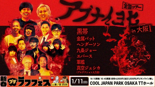 | 1/11(日) 16:45 | アブナイ ヨセin大阪 | 4,000円 | 黒帯とアブナイやつらによる寄席の全国ツアー大阪公演!金属バット、九条ジョーら豪華メンバーで贈る大好評の企画。 | 黒帯、金属バット、ヘンダーソン、九条ジョー、エバース、軍艦、真空ジェシカ |