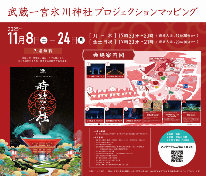 武蔵一宮氷川神社で、プロジェクションマッピングを含むライトアップイベント**「時結びの杜」**の開催が迫っています!