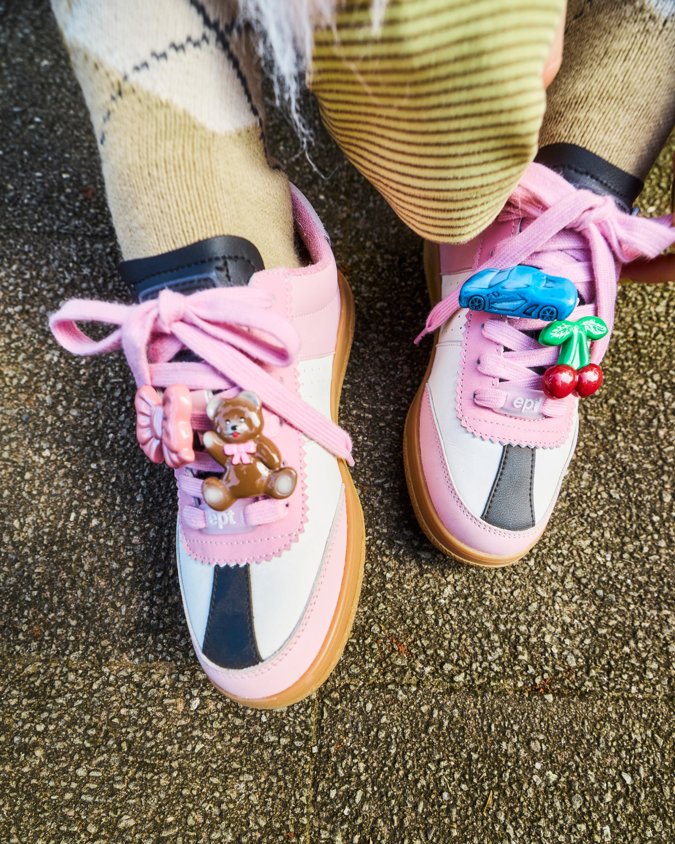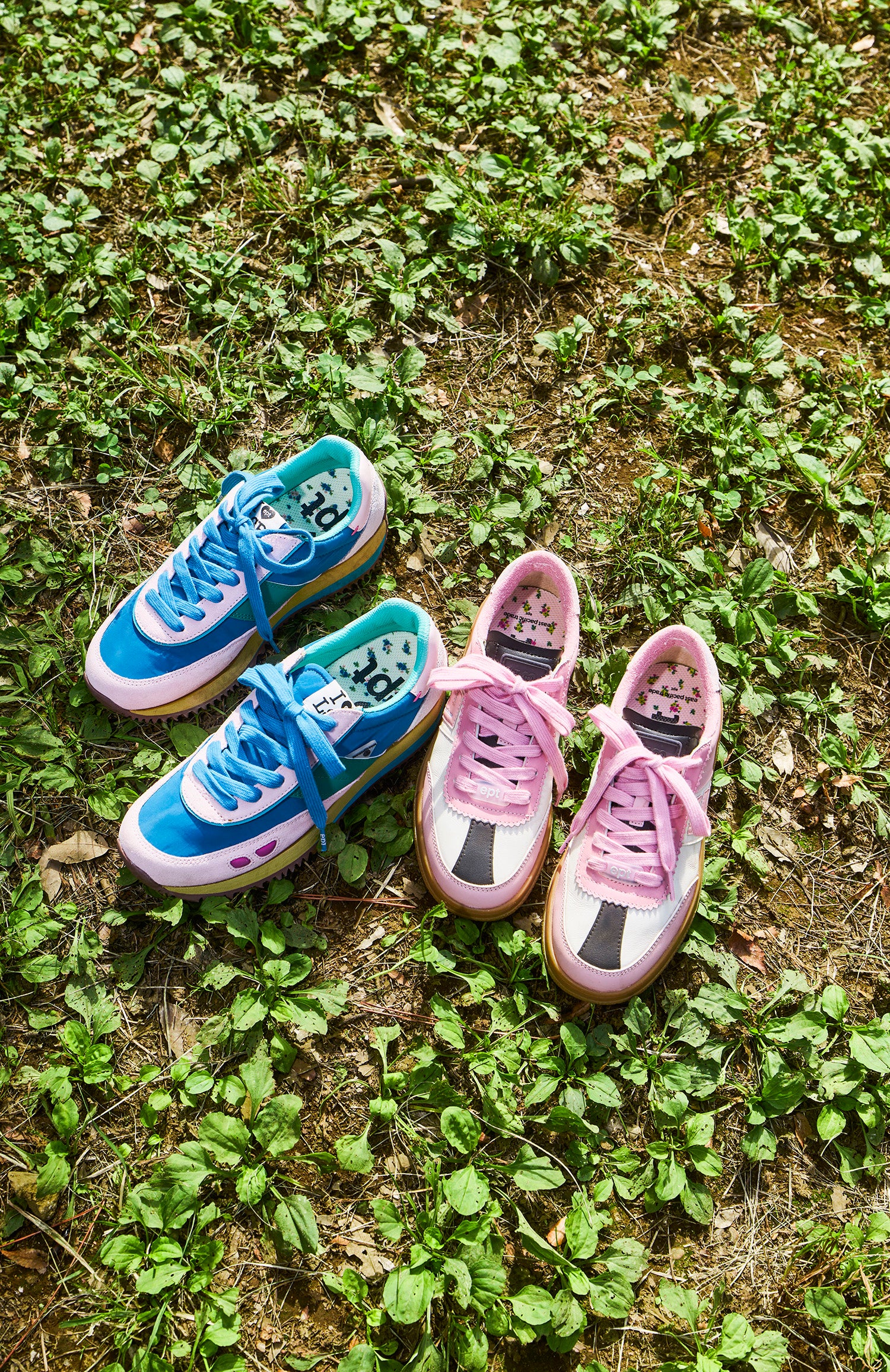 リトルサニーバイトらしいポップでキッチュなデザインが、EPTのミニマルで洗練された人気スニーカーモデルに融合。スニーカー2型に加え、オリジナルキャラクターのチャームやロングTシャツなどがラインナップされます。