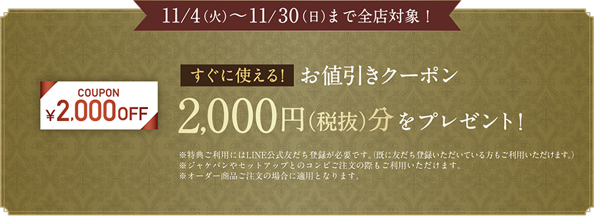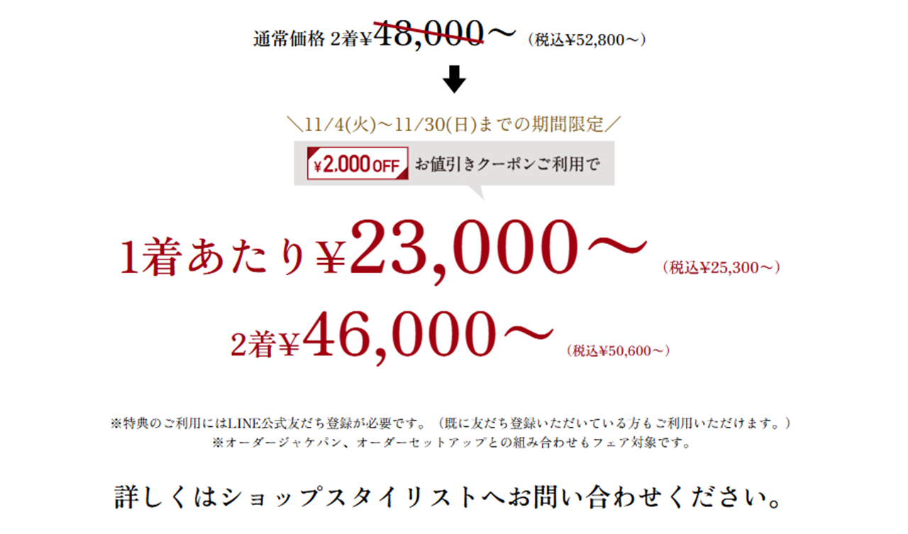 対象プランのご利用で、その場ですぐに使える**『2,000円分お値引きクーポン』をプレゼント。このクーポン利用で、本格的なオーダースーツが1着あたり23,000円~(税込25,300円~)**という破格の価格で購入可能となります。