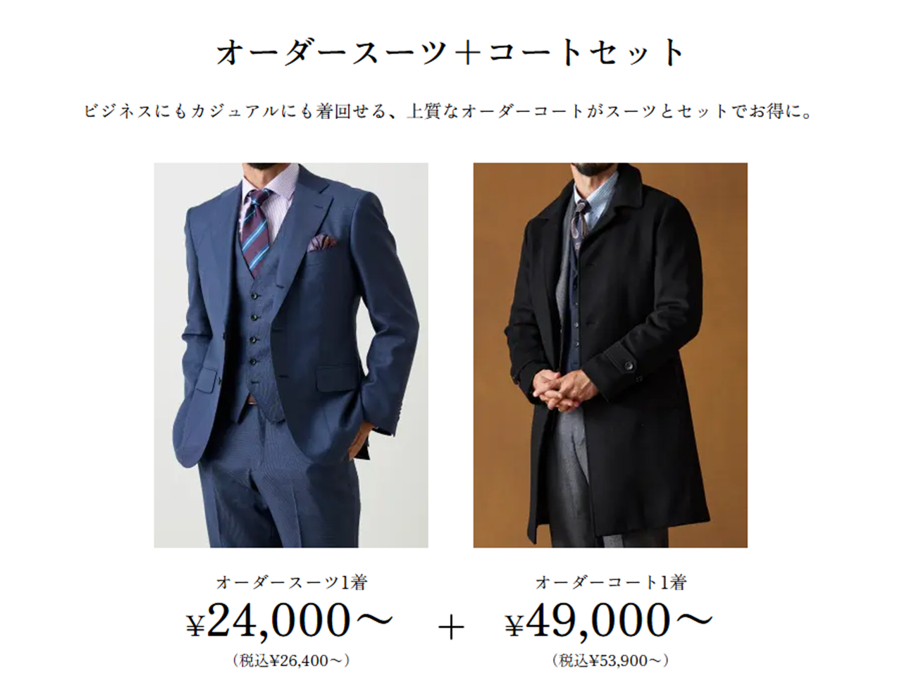 | 価格例 | クーポン利用で本格オーダースーツが1着あたり23,000円~(税込25,300円~) |