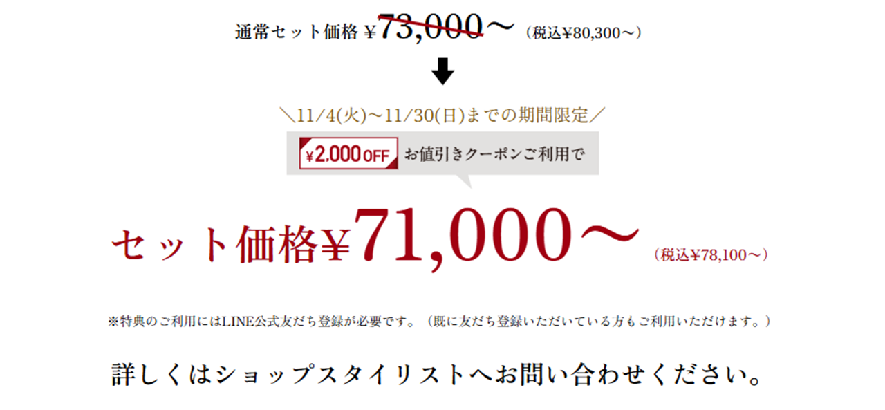 | 特典 | 2,000円分お値引きクーポン(その場で利用可能) |
