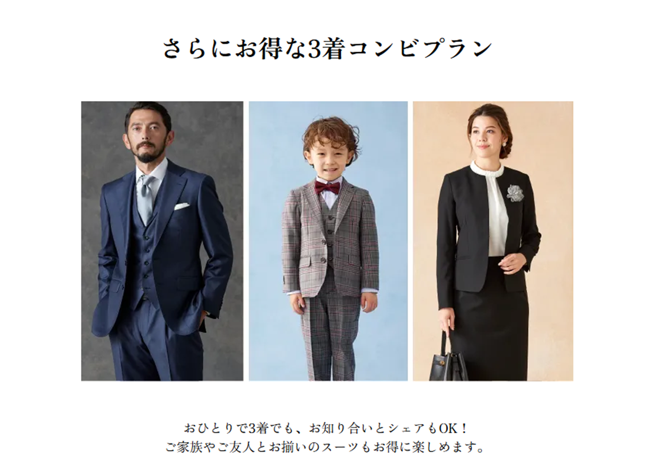 コンビプランの魅力: 2着以上購入の場合に1着あたりの価格が適用されるため、異なる価格帯のスーツを組み合わせて購入してもお得になります。