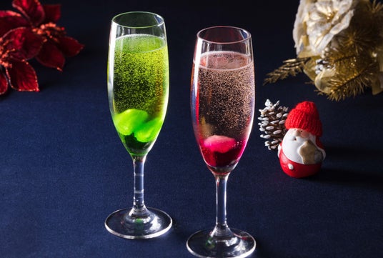 お食事をさらに華やかに演出する、赤(いちご)と緑(メロン)のクリスマスカラーの**スパークリングカクテル(各900円)**も別料金で注文可能です。