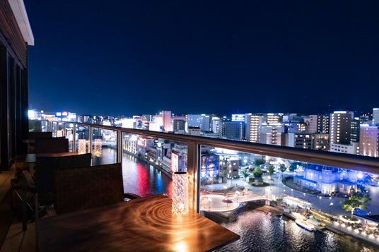 天神の街並みと那珂川のきらめきを一望できるテラスラウンジ