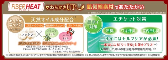 ・機能 :裏起毛、吸湿発熱、保湿、吸湿放湿、抗菌防臭、静電防止、ストレッチ、部屋干し臭軽減