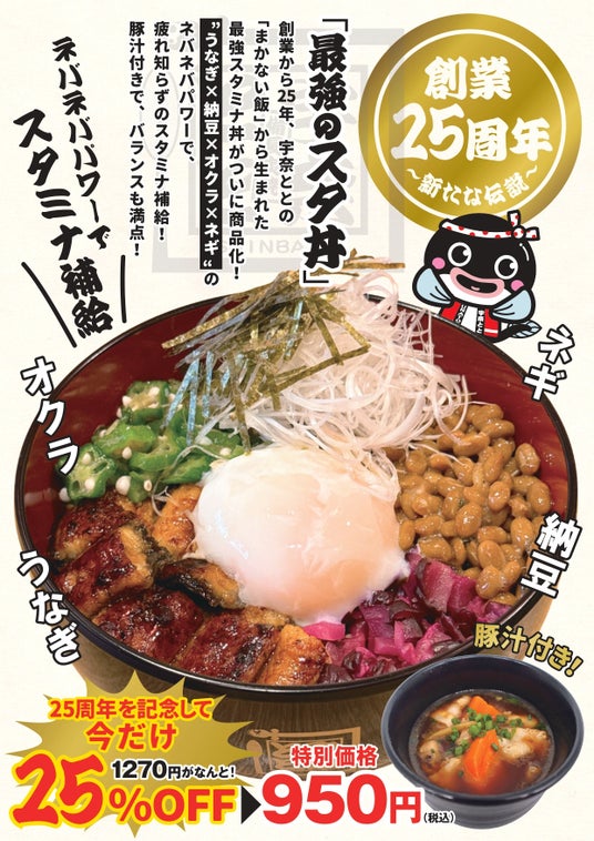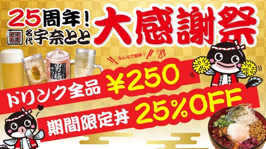 昼も夜も「2525」円満!宇奈とと25周年感謝祭 第2弾スタート!生ビール含むドリンク全品250円&まかない飯「最強スタミナ丼」が25%OFF!