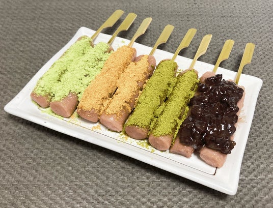 国産のたかきびを使用している1本1本手作りのピンク色の団子にきなこや、あんこなどをたっぷりとトッピング。