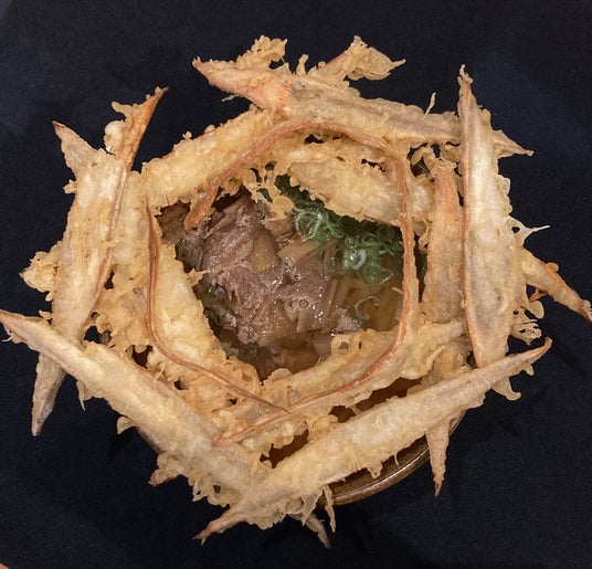 福岡の一般的な柔らかいうどんとは異なり、コシと透明感が特徴の細麺と器からはみ出る大きなごぼう天を楽しめます。