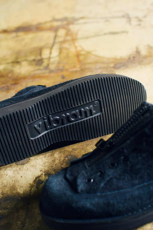 アッパーのラフアウト素材の堅牢さが際立つ際立つカラーリングとなっているが、軽量感のあるVIBRAMのソールと同色のジップパーツはどこかタウンユースな雰囲気を匂わせる。