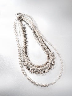 貴和クリスタルを使用したものをはじめ、3 本のネックレスを組み合わせることで、ボリューム感を出したアイテムです。その日のスタイルに合わせて組み合わせ、自由に身に着けていただけます。