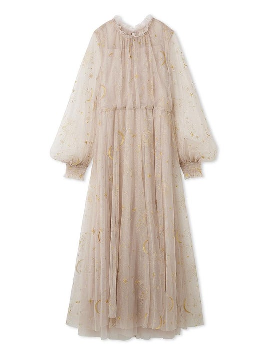 全体をラメプリント加工し、オリジナルの夜空モチーフを刺繍した華やかなチュールドレス。12星座や流れ星など様々なモチーフを取り入れています。